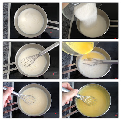 5º Para la crema de mantequilla, primero hay que batir el pudding de vainilla con tres cucharadas de leche y con las yemas. Después hay que poner el resto de la leche con el azúcar al fuego hasta que hierva. Agregar la anterior mezcla a la leche y bajar el fuego, remover continuamente hasta que la crema espese. Dejar que enfríe.