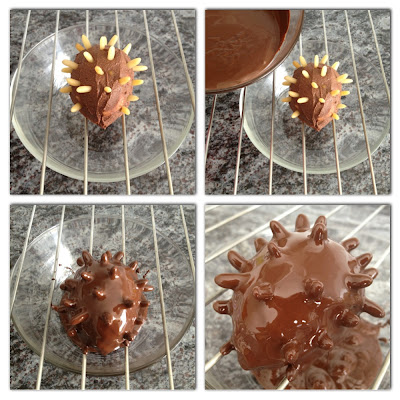 10º Colocar los erizos sobre una rejilla con un cuenco debajo. Echar por encima abundante chocolate dejando que caiga en el cuenco para posteriormente reutilizar. Colocar sobre papel vegetal para que seque.