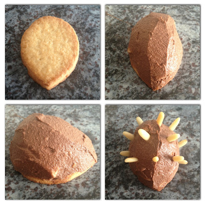8º Con la masa, hacer sobre la galleta la forma del erizo y colocar en una bandeja sobre papel vegetal. Colocar los piñones por todo menos por la cabeza y meter en la nevera 1 hora para que endurezcan.