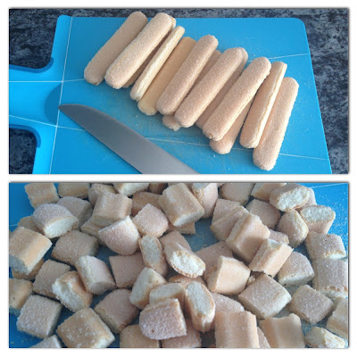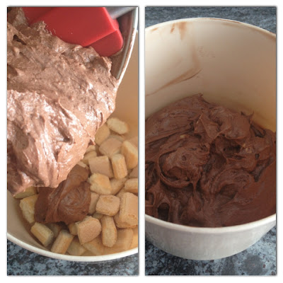 7º Cortar los bizcochitos en dados y echarlos en un bol. Agregar la crema de mantequilla a los dados y mezclar con cuidado para que no se deshagan.