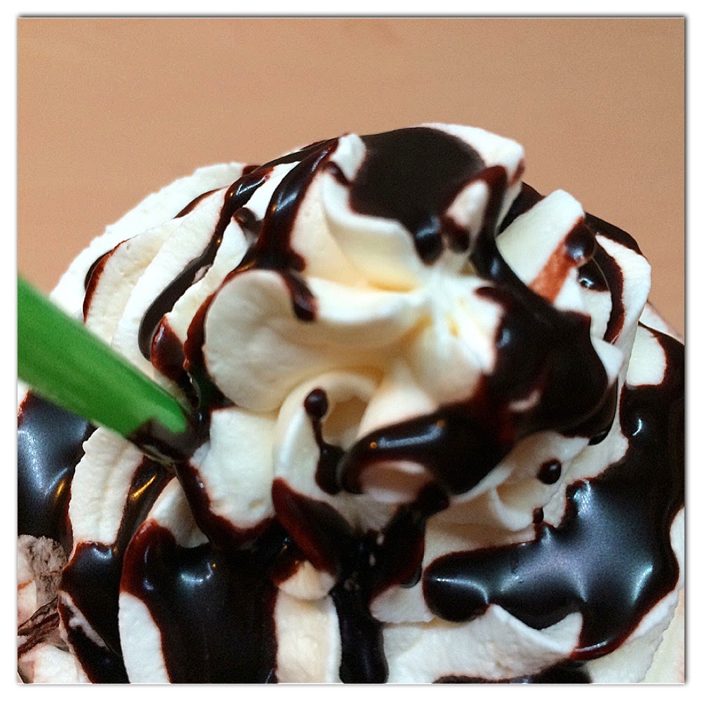 4º En los vasos repartir el hielo, verter el café sobre este y coronar la cima con la nata y una manga pastelera. Finalizar con una pasada de sirope de chocolate en la nata.