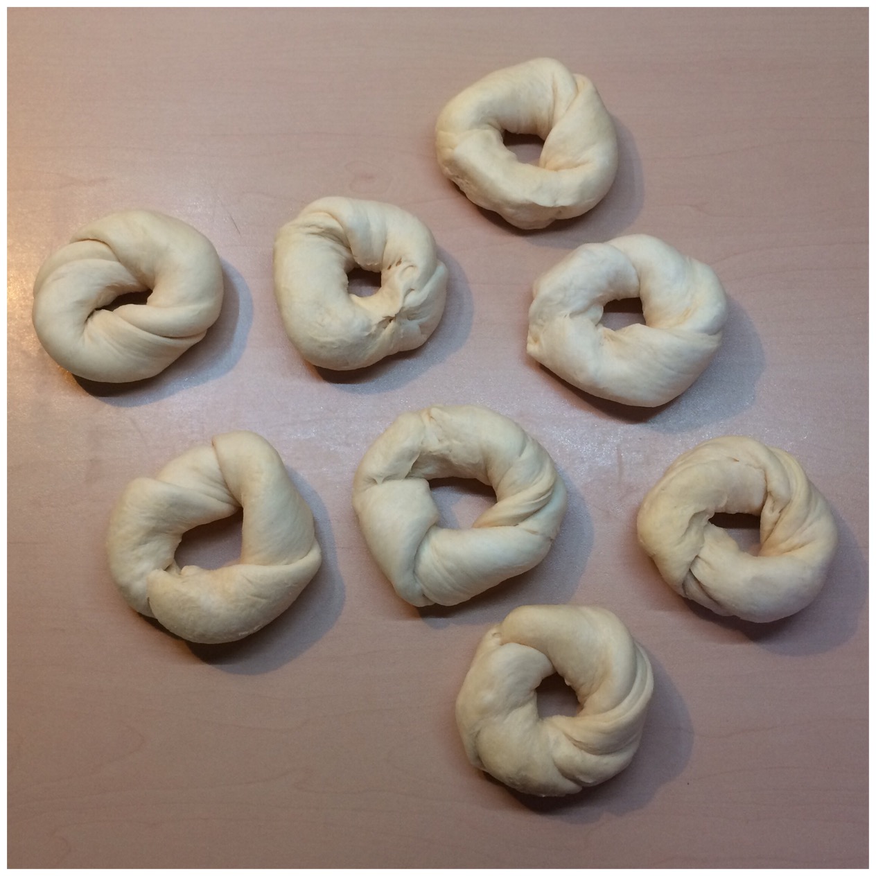 5º Coger cada una de las porciones de masa y doblar por la mitad y estirar de forma que a lo largo tengan un mínimo de 10 cm. Tomar la masa por los extremos, dar 3 vueltas y enrollar de forma que los dos extremos se unan y forman un círculo con agujero.
