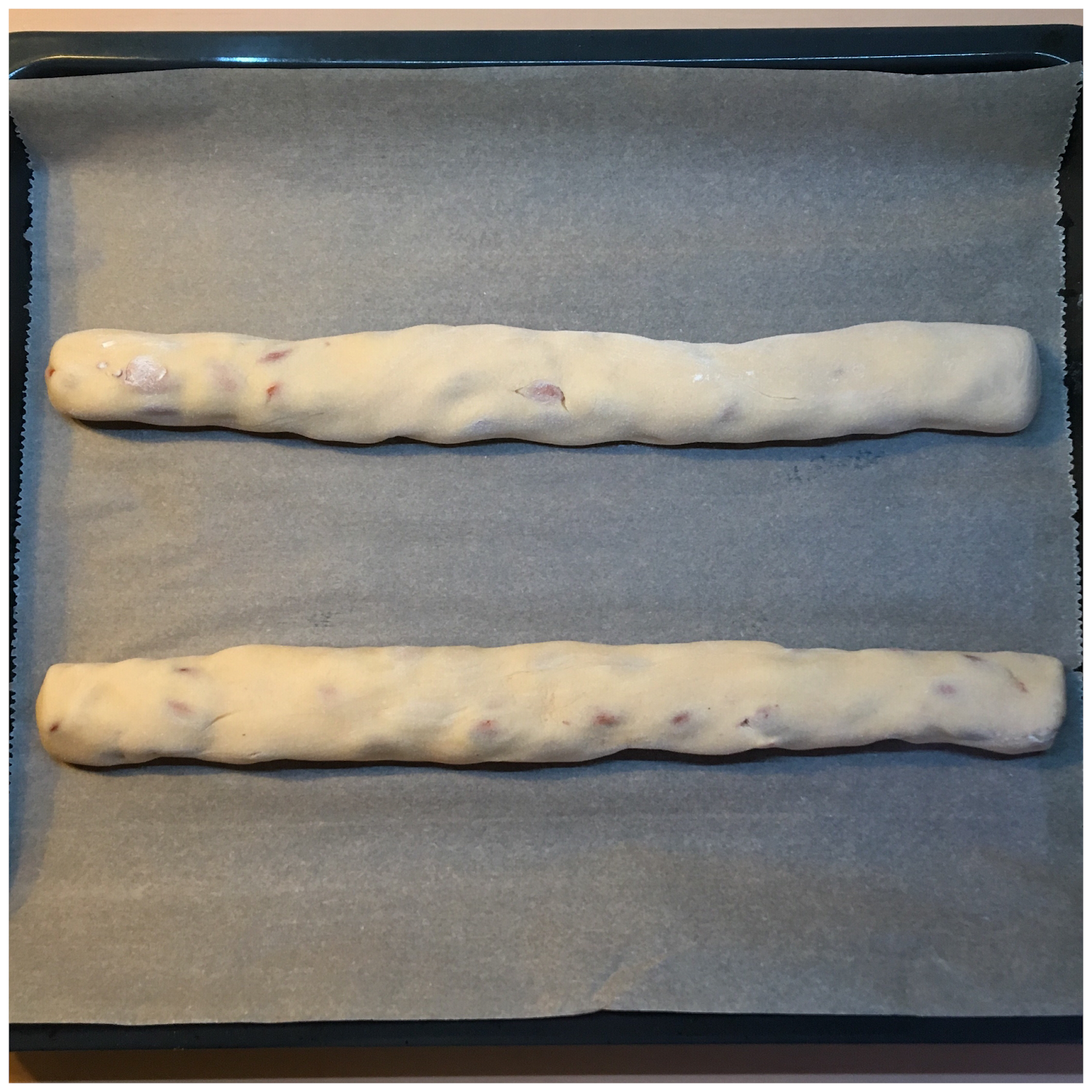 4º Dividir la masa en dos partes y dar forma alargada a cada una. Colocar sobre papel vegetal en una bandeja de horno.