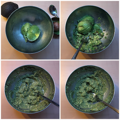 2º Quitar la carne de los aguacates y poner en un recipiente con el zumo de limón. Aplastar con la ayuda de un tenedor hasta obtener una masa.